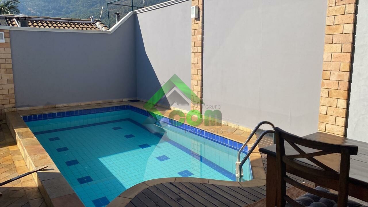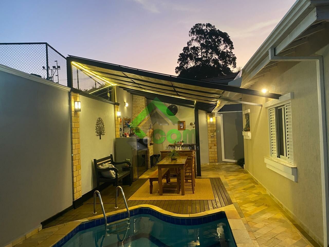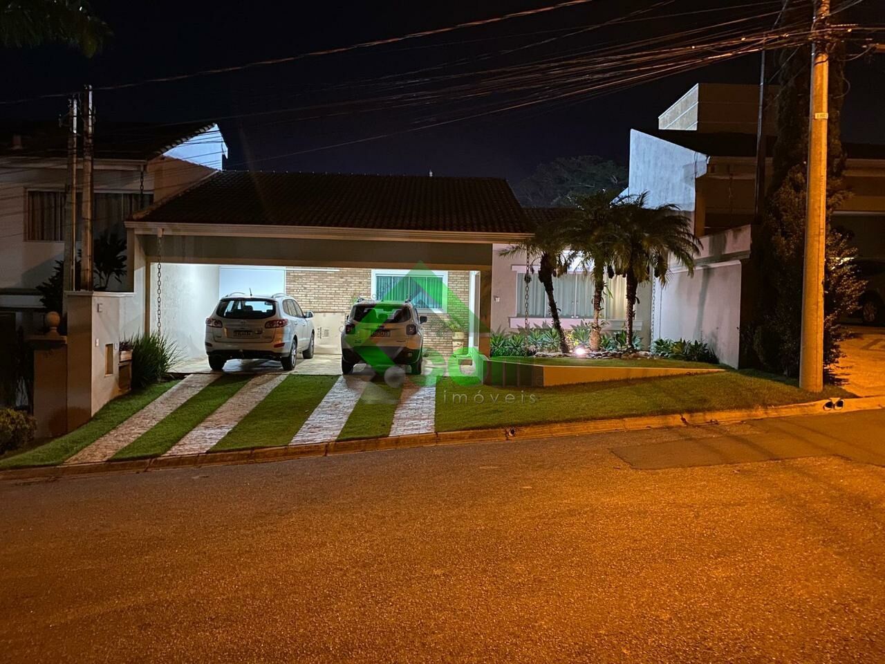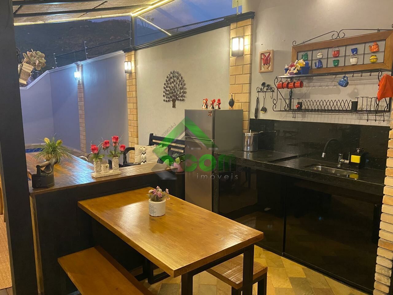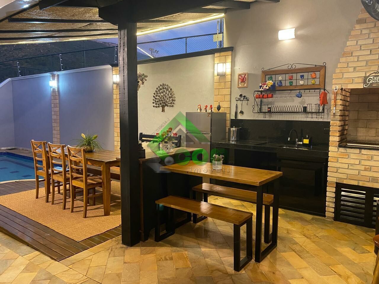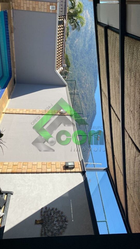 Piso inferior: 1 dormitório, sala de TV com sacada, sala de jantar, lavabo, cozinha, despensa, área de serviço, depósito, churrasqueira, quadra de tênis, piscina aquecida, edícula.