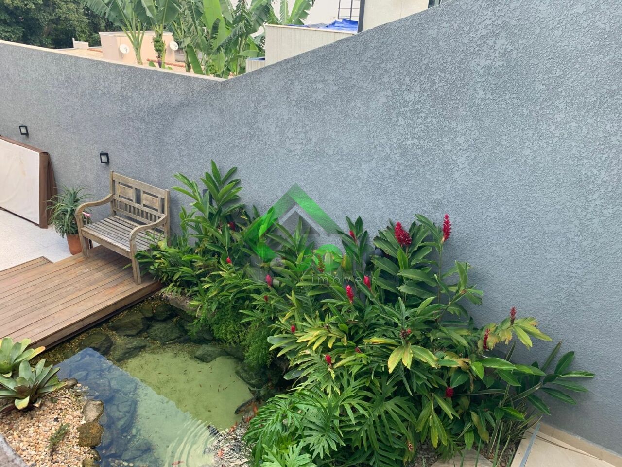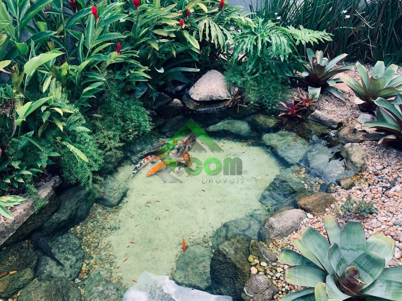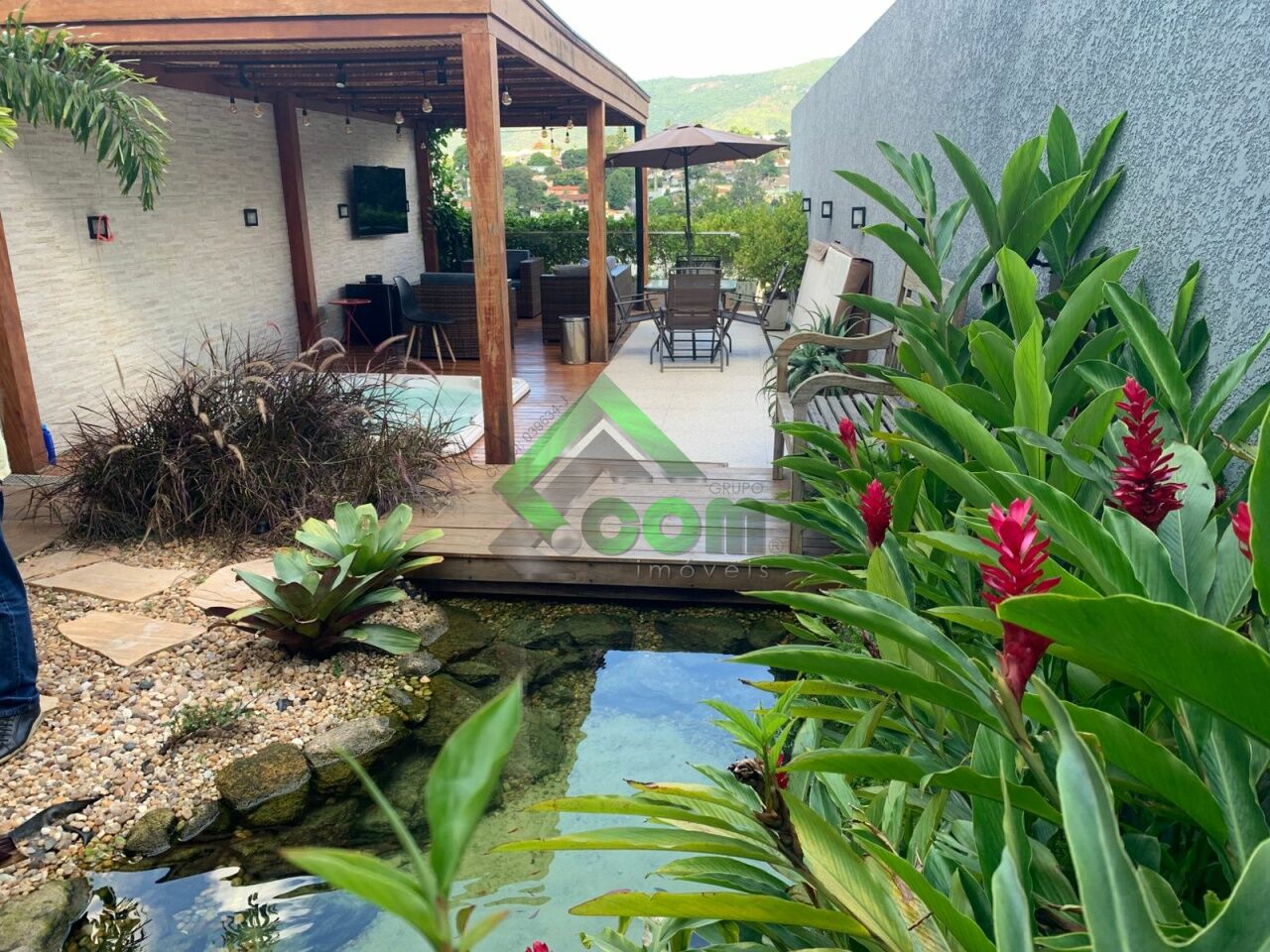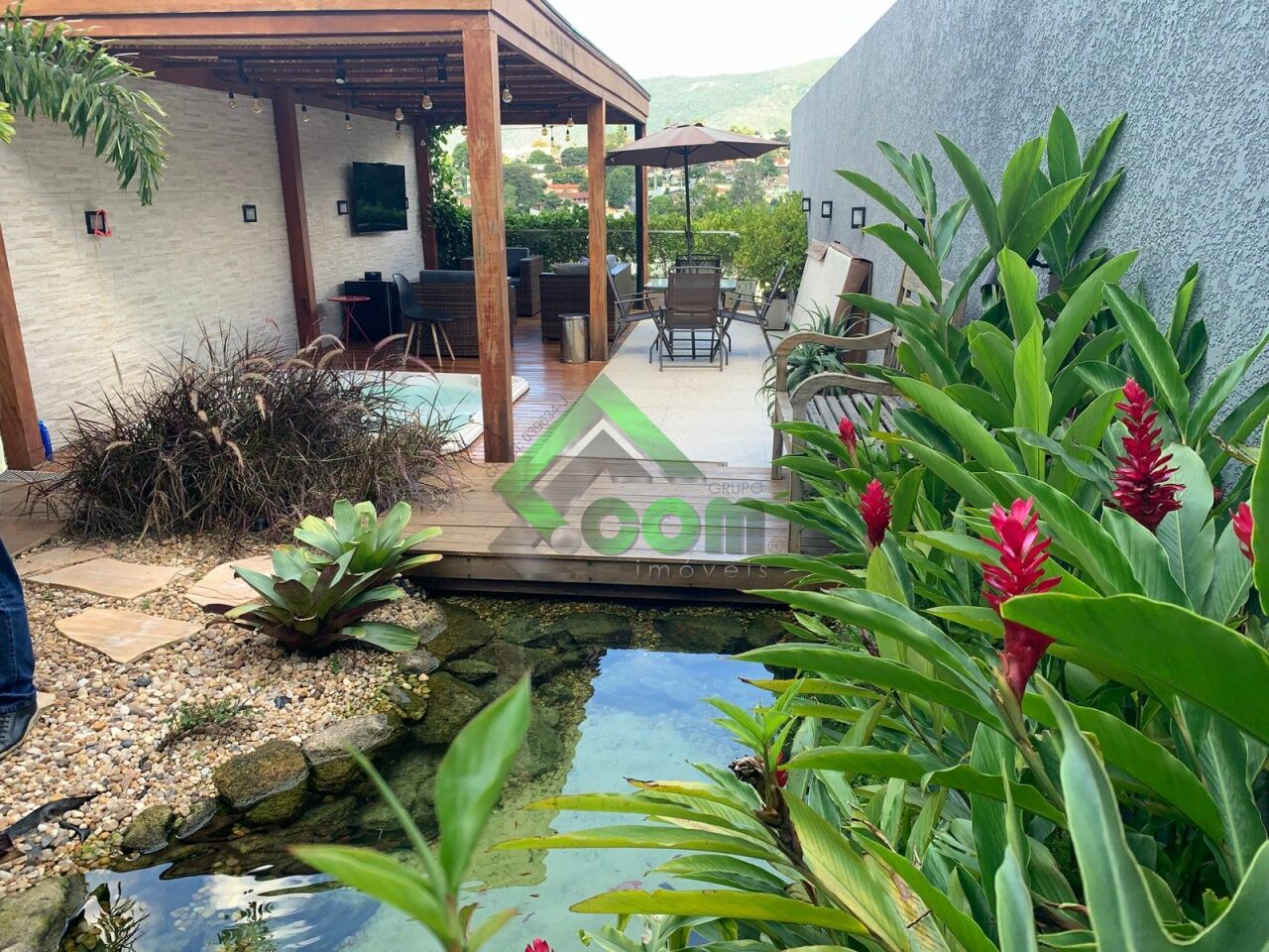 No piso inferior, sala espaçosa, lavabo, cozinha integrada, área da serviço e espaço gourmet com lago ornamental, espaço zen com pergolado coberto com banheira de hidromassagem para 4 pessoas, ducha e deck em madeira, lago ornamental e sistema de aquecimento a gás.
