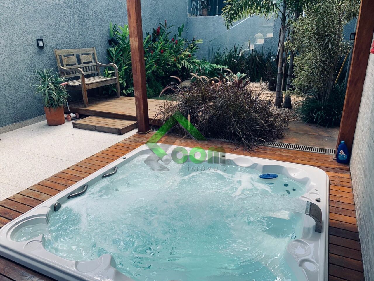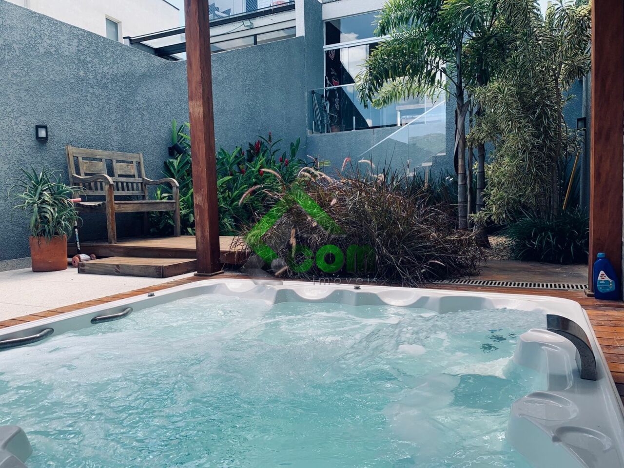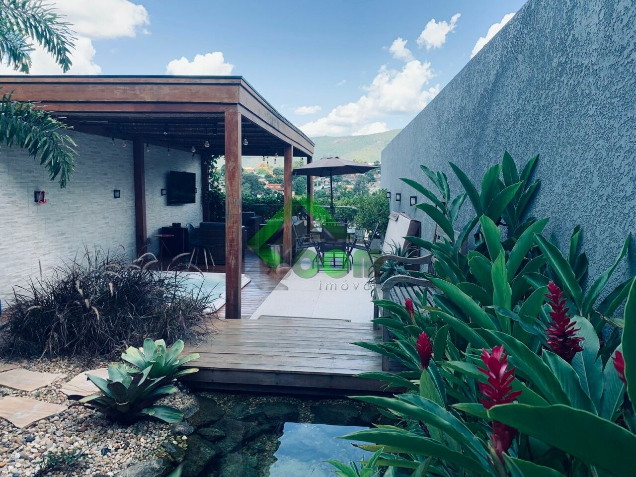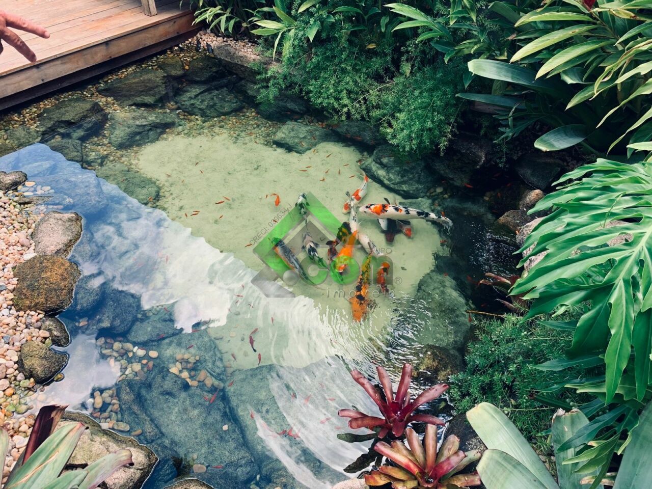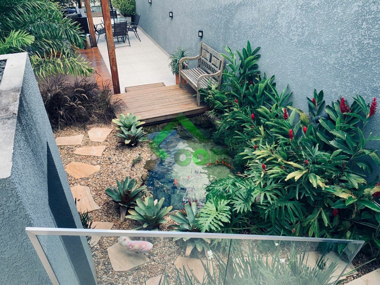 No piso inferior, sala espaçosa, lavabo, cozinha integrada, área da serviço e espaço gourmet com lago ornamental, espaço zen com pergolado coberto com banheira de hidromassagem para 4 pessoas, ducha e deck em madeira, lago ornamental e sistema de aquecimento a gás.